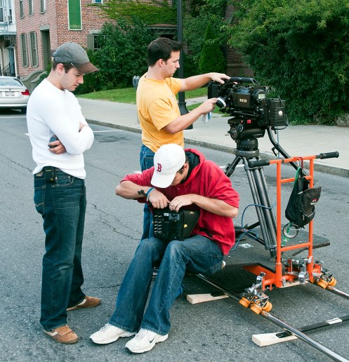 On that first day of shooting, the crew began setting up the equipment at the end of the block at dawn. Photos in a previous posting in this blog show how Warren Street and the The Cascades looked that day in the early morning light (click on the names to see photos). In this shot, cinematographer Dennis Donovan (in the red shirt) and assistant Phil Toran set up the Red One digital cinema camera – the current state of the art in digital cinema technology – while producer Bob Cammisa looks on (click on any photo to enlarge):