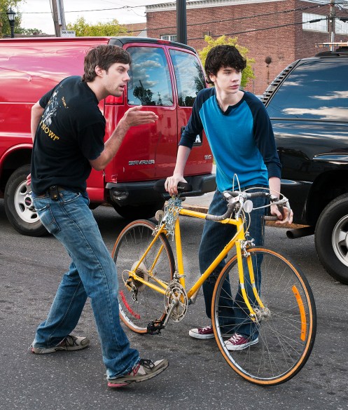 Here is director Brian McAllister instructing actor Ian Hyland on exactly where to ride his bicycle down the street to the cafe: