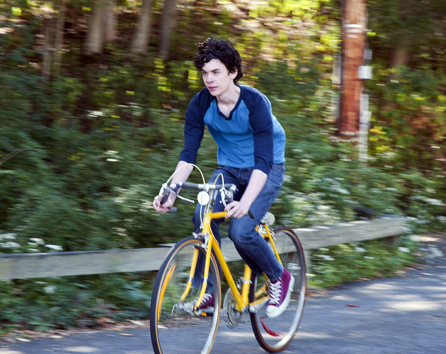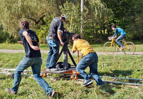 In this photo, with the Red One mounted on rails, director and crew struggle to keep pace with Ian as he streaks by on his bike: