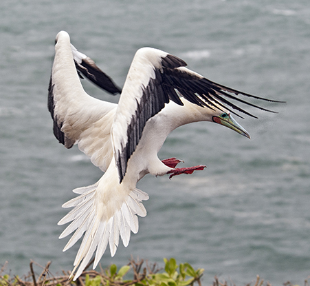A visit to the Kilauea Point National Wildlife Refuge is an experience not to be missed by any lover of the natural world and its wildlife. The seabirds that can be seen at the refuge include Laysan albatrosses, red-footed boobies, red-tailed and white-tailed tropicbirds, great frigatebirds, and wedge-tailed shearwaters. The most numerous are the red-footed boobies, which nest by the thousands on the neighboring cliffs. At the time of my most recent visit to the refuge in March of 2015, the cliffs were sheltering 1,500 pairs of red-footed boobies, all busy gathering materials to build nests, tearing out pieces of vegetation from the perimeter of Kilauea Point and flying off with them to their nesting sites. Here is a red-footed booby (Sula sula) about to grab an attractive piece of vine: