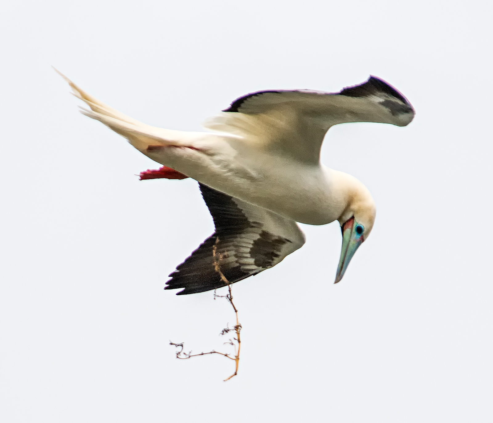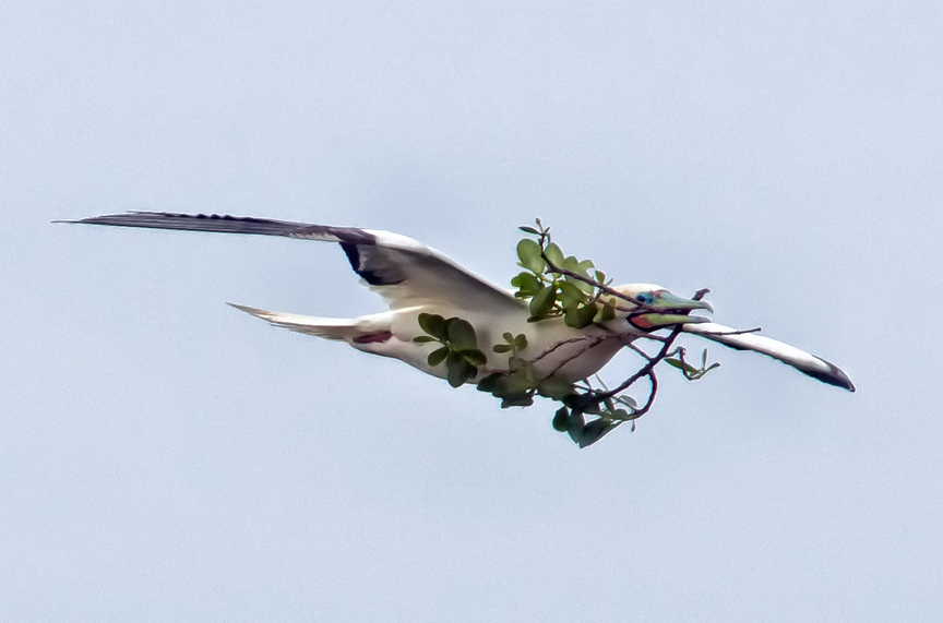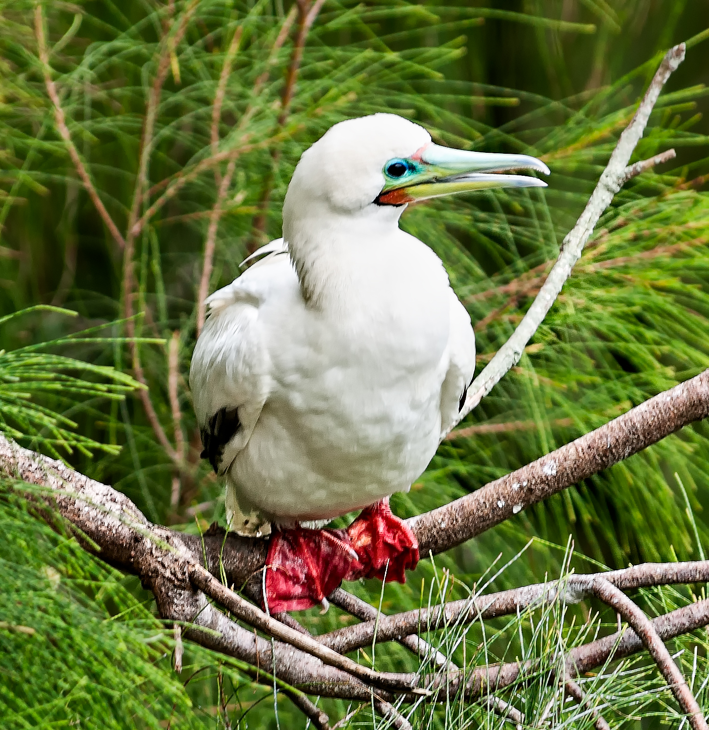 Red-footed boobies were also visible perched in nearby trees — note the distinctive red webbed feet and blue bill: