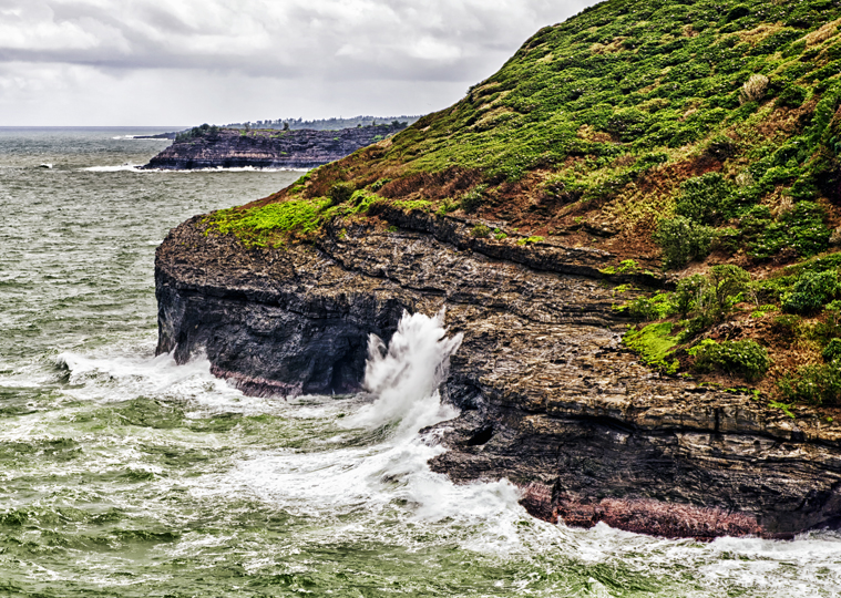 Looking east from Kilauea Point, you can see rugged cliffs characteristic of the coastline of Kauai, which serve as nesting sites for thousands of large seabirds: