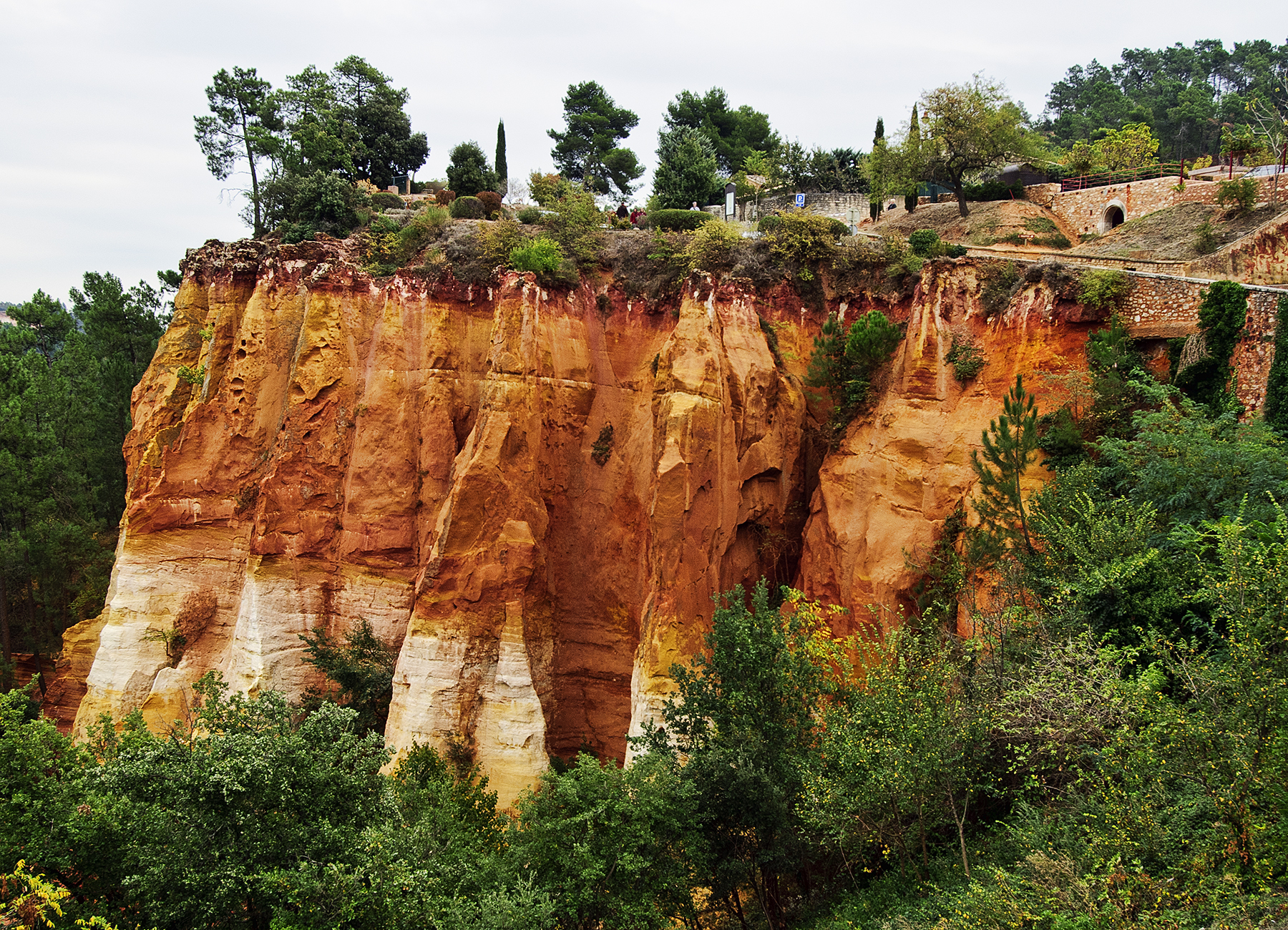 Après une courte promenade le long du haut de cette falaise, on arrive aux carrières d’ocre, òu pendant des siècles on a miné les matériaux qu’on a utilisés pour construire les bâtiments du village. Dans les carrières on voit beaucoup de formes colorées et fantasques comme ceux-ci: