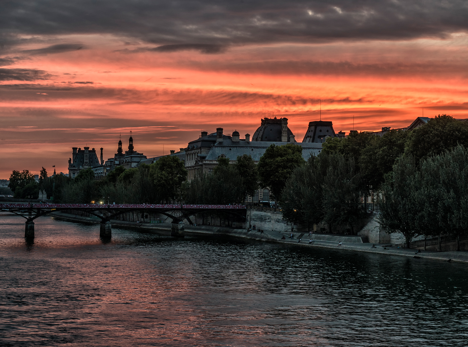 Here is a view to the west from the Pont Neuf at sunset, showing the Pont des Arts, the Louvre and surrounding buildings. Originally the principal palace of the kings of France, the Louvre was opened to the public after the French Revolution and converted into one of the greatest art museums of the world: