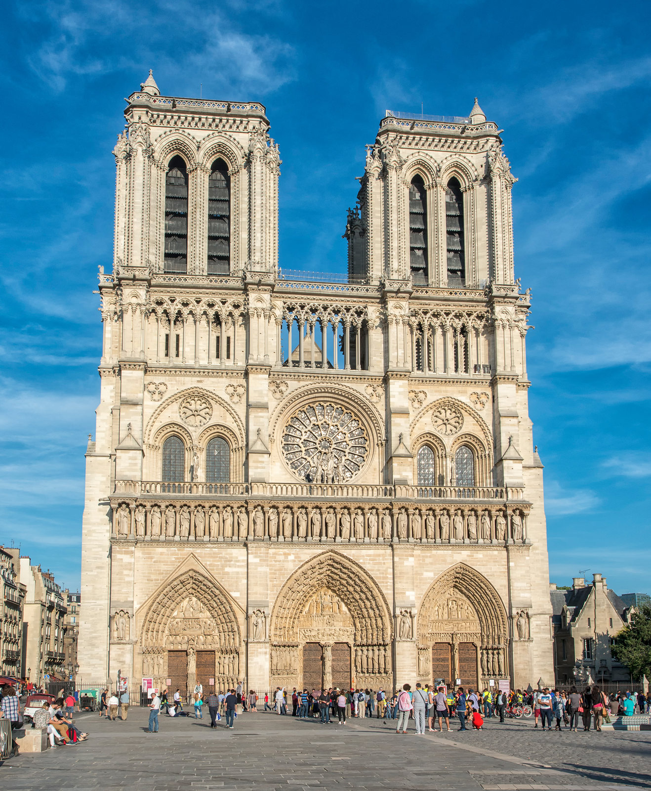Another famous Paris sight is of course the Cathedral of Notre Dame, built in the Gothic style during the 12th century. The cathedral sits on the eastern half of the Île de la Cité, an island in the river Seine which is the oldest part of the city. The cathedral is also the principal location of Victor Hugo’s great novel Notre Dame de Paris (translated into English as The Hunchback of Notre Dame). Here is a photo of the great western façade of the cathedral, as seen from the parvis, or square, that spreads out in front of the façade:
