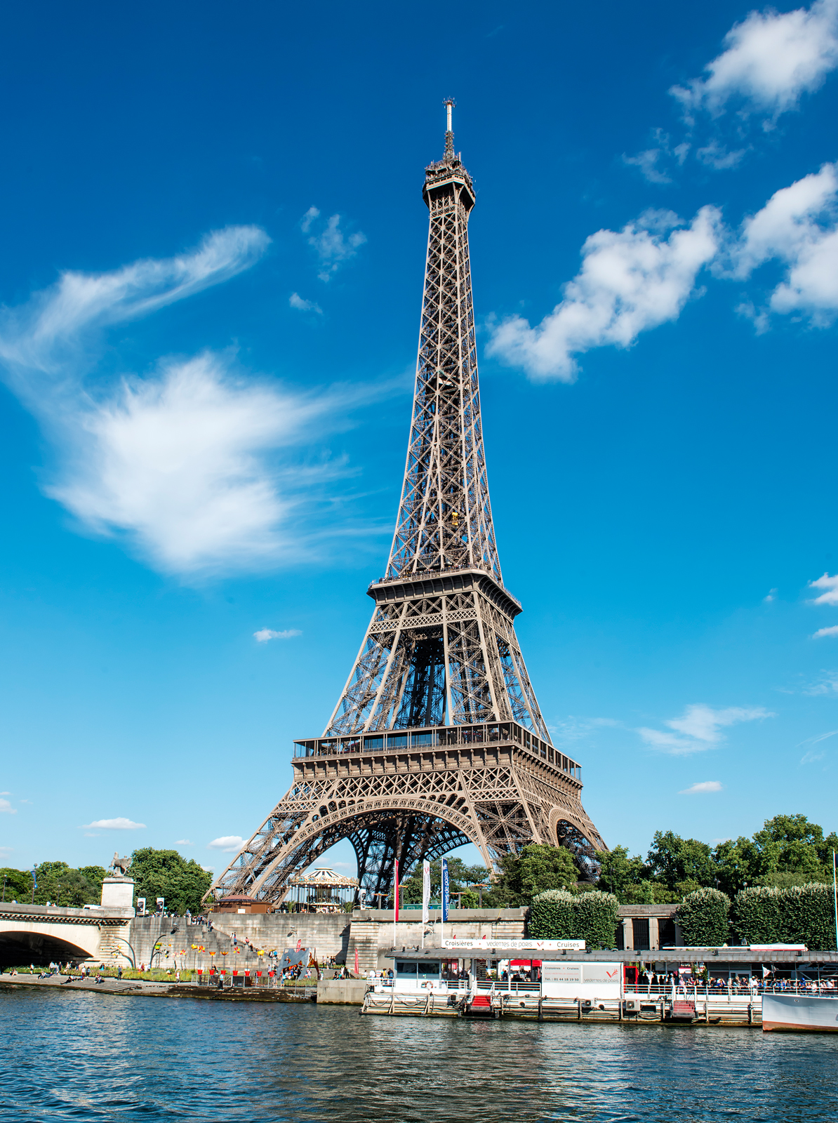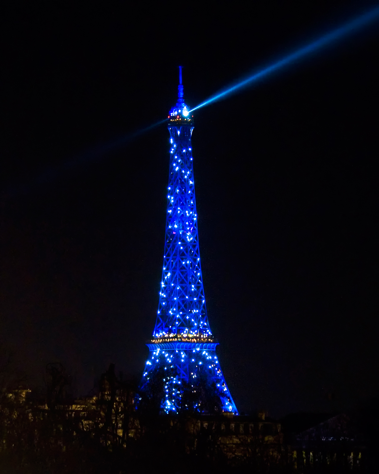 No photo essay on Paris would be complete without a view of the city’s most famous symbol, the Eiffel Tower, built in 1889 as the entrance to the 1889 World’s Fair. Here are two photos, one taken during the day from a boat on the Seine, the other at night in blue light taken during a light show: