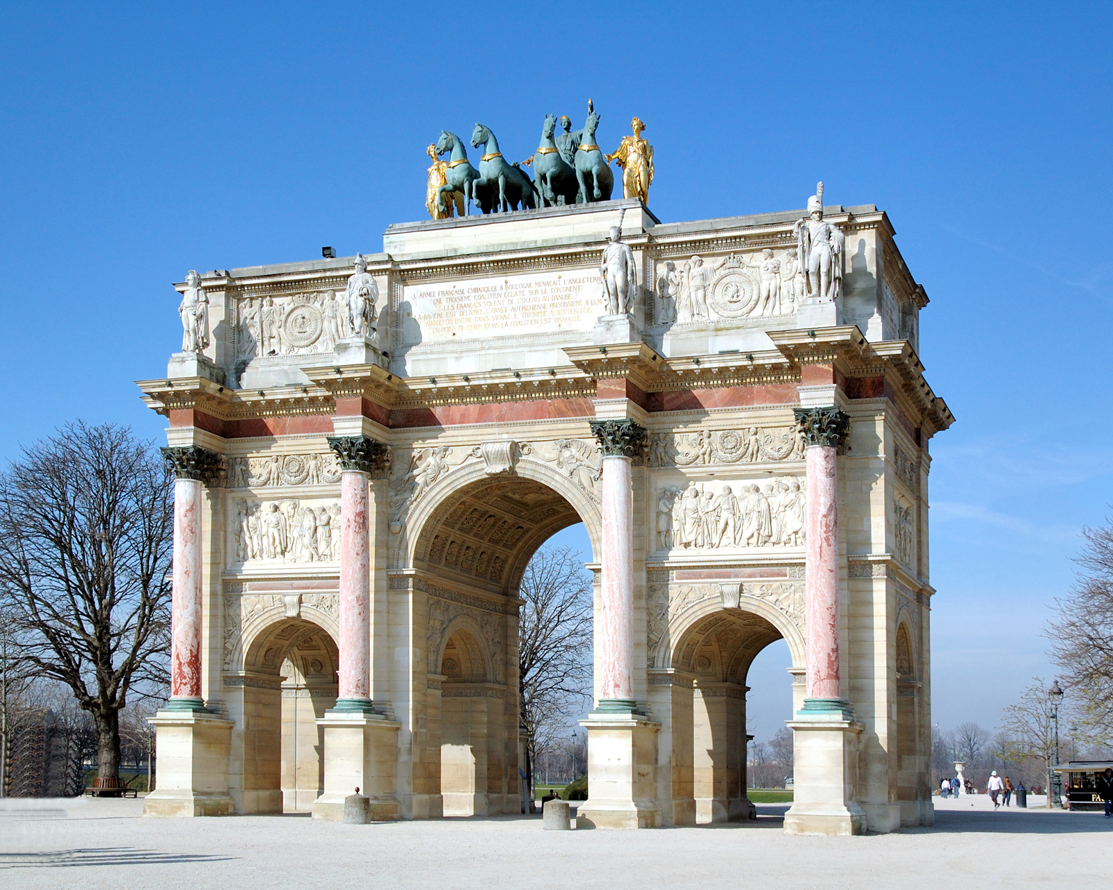 Another major Paris sight is the Arc de Triomphe du Carrousel. Located at the eastern entrance to the Tuileries, the arch was built between 1806 and 1808 to celebrate Napoleon’s victory at the Battle of Austerlitz in 1805 and other military victories won that year.