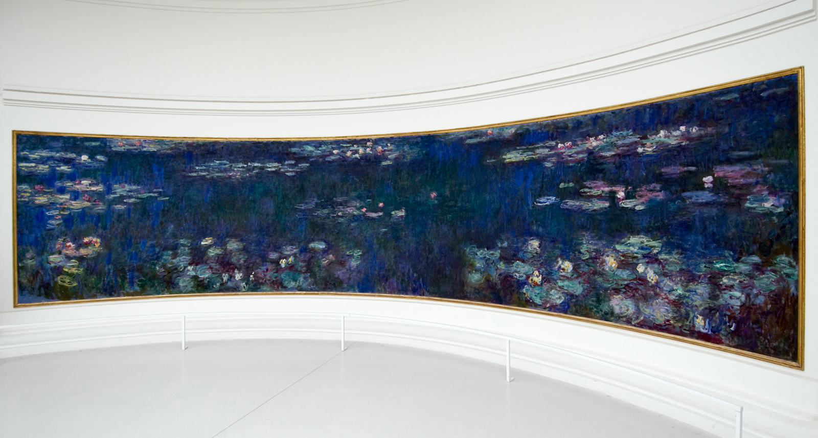 Paris is of course well known for its great museums, particularly art museums. One of my favorites is the Orangerie, located at the western end of the Tuileries adjacent to the Place de la Concorde. The ground floor of the museum contains two large oval rooms, the walls of which are covered with panoramic panels containing paintings of waterlilies by Claude Monet. The ceilings of these rooms have been replaced with glass, in order to honor Monet’s wish that the paintings be seen in natural light. The following is an example of just one of these magnificent panels: