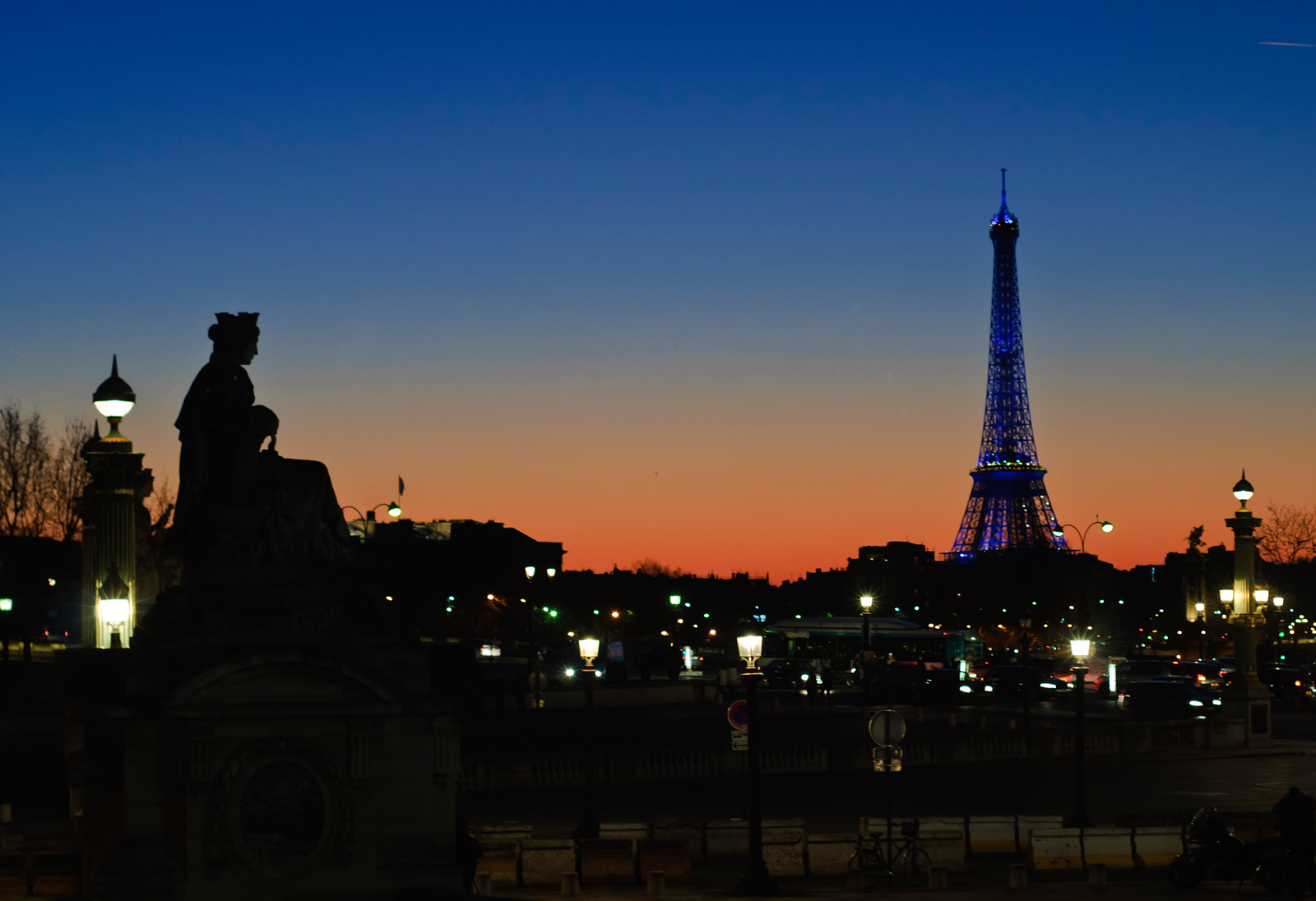 Next to the Orangerie is a wonderful view over the Place de la Concorde, seen in this photo just after sunset: