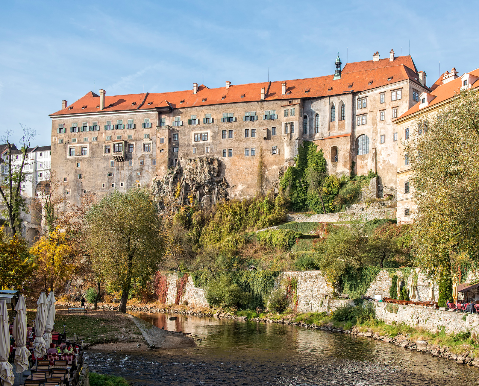 The town of Cesky Krumlov is a UNESCO World Heritage site located on the banks of the Vltava River (the Moldau) in the South Bohemian region of the Czech Republic, about 2-1/2 hours south of Prague by car. It was built during the 14th through the 17th centuries, primarily in Renaissance style, with additional gothic and baroque elements. It is situated around a 13th century castle which is the second largest in the Czech Republic (after the Prague castle), comprising a total of 40 buildings. UNESCO characterizes the town as “an outstanding example of a small central European medieval town whose architectural heritage has remained intact thanks to its peaceful evolution over more than five centuries.”
